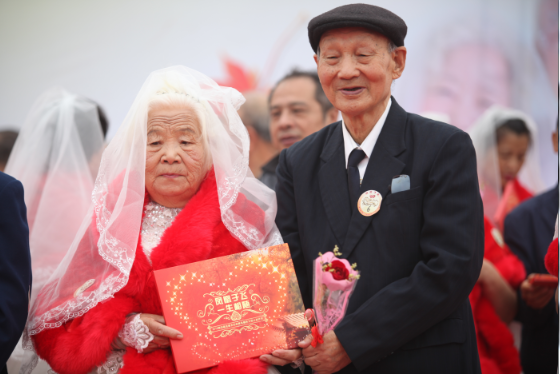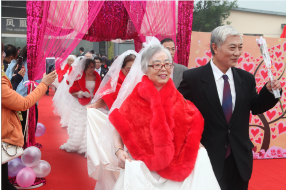 丰富温馨的活动环节让老年人经历了一次感动、难忘的金婚庆典仪式:“五十年风雨同路”——金婚夫妇身着婚纱礼服甜蜜携手走红毯,每一步都是手挽着手的坚定不渝。走过浪漫的鲜花拱门,在签名墙上共同写下爱的箴言;“这一路感谢有你”——金婚夫妇恩爱照在大屏幕上循环播放,金婚男士为女士献上代表坚贞爱情的玫瑰,秀出了金色约定的温馨与感动,每一个羞涩的笑容,一次深情的对视,都是相濡以沫的最好见证;“激情燃烧的岁月”再回首——老人牵手跳起熟悉的舞步,追忆年轻时那些激情燃烧的岁月,展现老年人独特的精气神儿。“蒙眼找妈妈”——记忆中的妈妈还是年轻的模样,如今抚摸着这苍老的面庞,粗糙的双手,子女百感交集,真情流露那一刻让人感动不已;“感恩父母情”——子女为父母跪敬孝心茶,表达对父母的感恩与祝福;“传播爱的希望”——幼儿园可爱的小朋友为老人们带来集体表演,向老人们献上来自小小人儿的一份心意,让老人们感受到来自新一代的关爱和温暖。同时也让孩子们接受传统美德的洗礼,在幼小的心灵上播下了尊老、敬老、爱老的种子,寓意传播爱的希望。