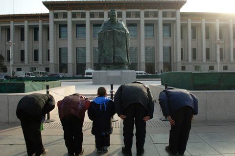 在近年来社会道德严重滑坡的情况下,2011年1月11日,天安门广场东侧国博北门矗立了“孔子雕像”,使国人看到了曙光,精神为之振奋。作为一个传统文化的热爱者和传播者,我更是激动。我在“现代修订版《弟子规》”书的扉页上印上了雕像照片,以昭天下;但同时我内心在想,国博北门位置似乎有些偏……