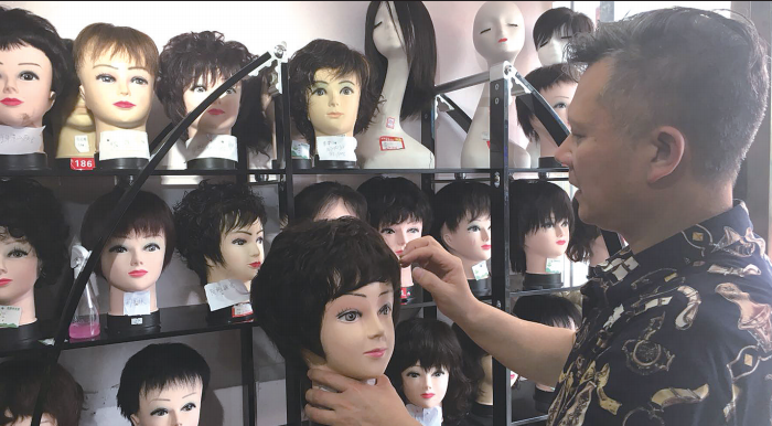 正在采访时,一对50多岁的夫妇来到小店。大姐看上去是个性格豪爽的人,进门就把头上的假发摘掉,她说:“老板啊,帮我把假发保养一下好吗?我们还得赶火车回老家。”