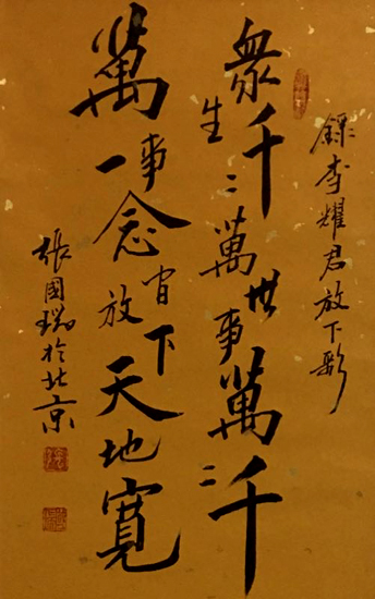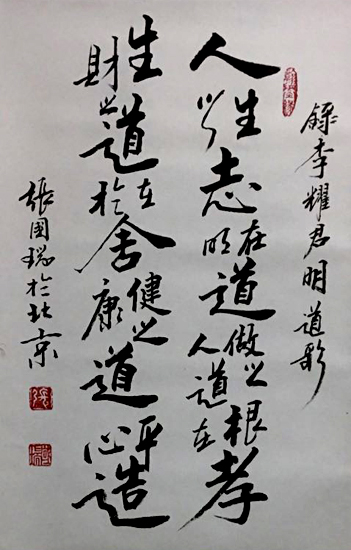 张国瑞,1960年出生于内蒙赤峰,祖籍河北河间。号原野愚夫、泰然斋主。和谐中国书画院院士、中国国际经济文化艺术协会会员。是北京书法家协会会员,国家人事部中国书画人才研究中心高级教研员、一级书法师。