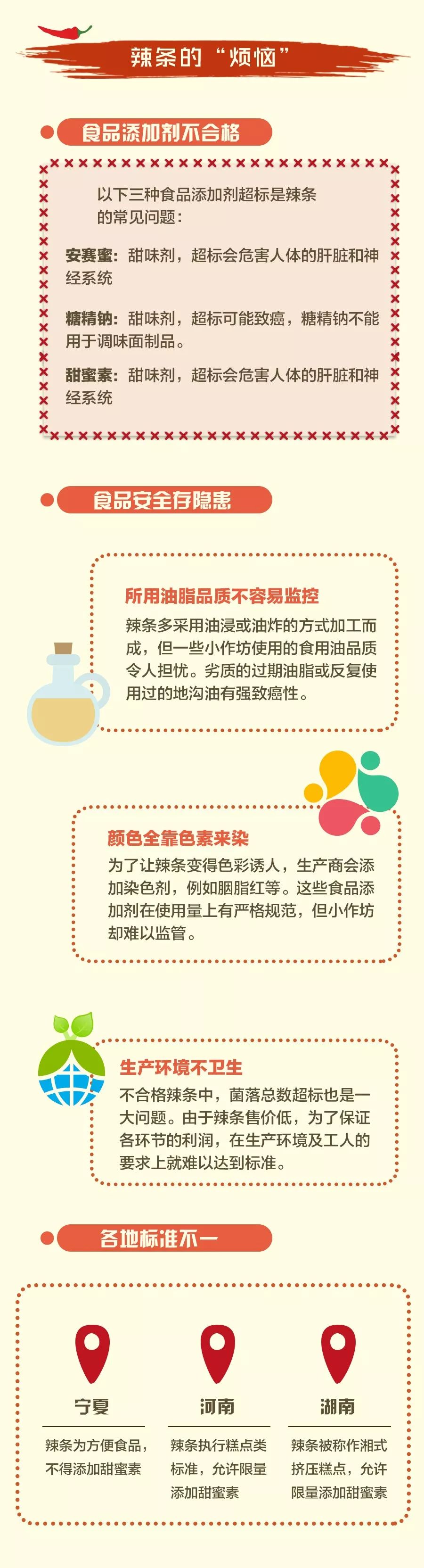 此外,辣条行业还存在标准不一的问题。目前,市面上辣条厂家一般按照地标执行生产。在不同省份,不仅辣条的归类不同,添加剂使用的种类和数量也存在差异↓↓