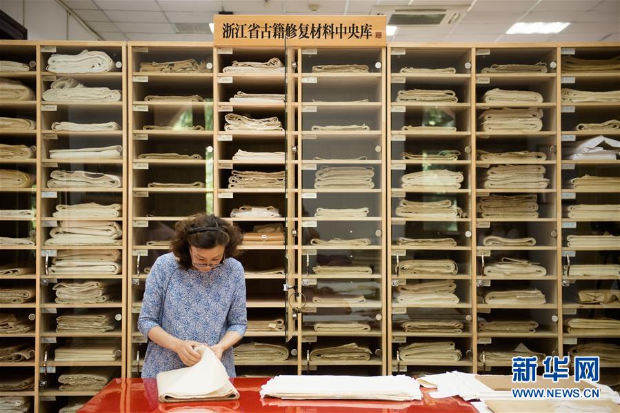 5月23日,阎静书从浙江省古籍修复材料中央库取出合适的纸张,准备进行修复工作。