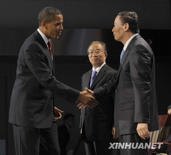 7月27日,首轮中美战略与经济对话在美国华盛顿开幕。中国国家主席胡锦涛特别代表、国务院副总理王岐山,国务委员戴秉国出席开幕式。这是美国总统奥巴马在致辞前问候王岐山(右)和戴秉国。新华社记者张岩摄