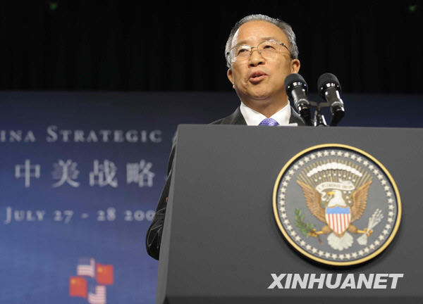 7月27日,中国国家主席胡锦涛特别代表、国务委员戴秉国在首轮中美战略与经济对话开幕式上讲话。当日,首轮中美战略与经济对话在美国华盛顿开幕。新华社记者张岩摄