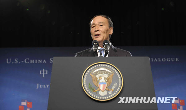7月27日,中国国家主席胡锦涛特别代表、国务院副总理王岐山在首轮中美战略与经济对话开幕式上讲话。当日,首轮中美战略与经济对话在美国华盛顿开幕。新华社记者张岩摄