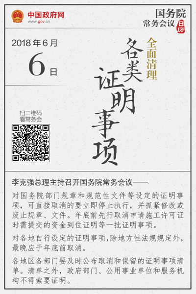 当天会议决定全面清理各类证明事项。今年3月,李克强在《政府工作报告》和随后的总理记者会上明确表示,今年要清理群众和企业办事的各类证明,没有法律法规依据的一律取消。
